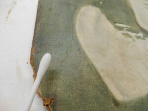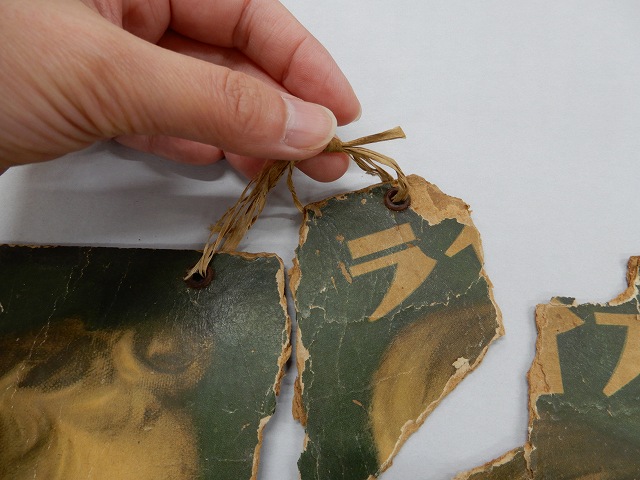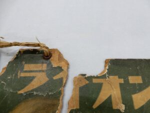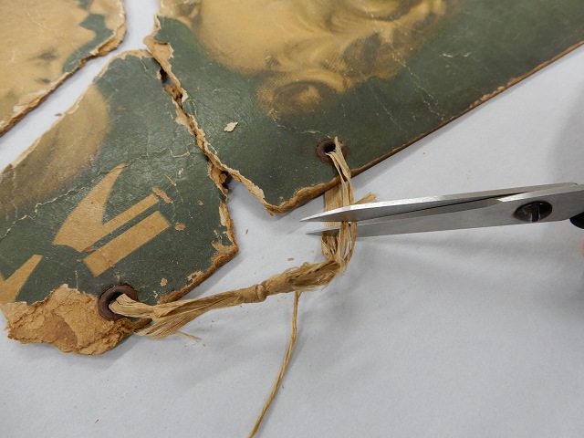 吊り下げ紐と、錆びた金属ハトメを除去した後、クリーニングスポンジと刷毛を用いてドライ・クリーニングを行い、表面の塵や埃を除去した。
