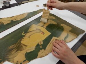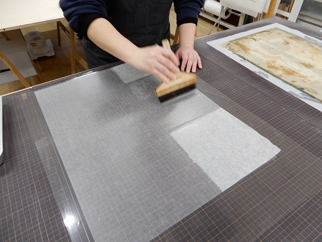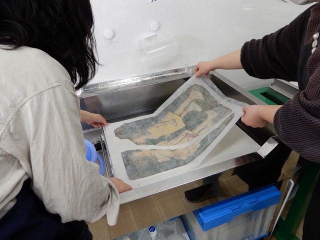 乾燥後の本紙に対して、大きな欠損箇所については染色した和紙で補填した。破れや折れ跡については短冊状の和紙で補強し、分離していたパーツをすべて繋ぎ合わせたあと、裏打ちにより裏面全体を補強した。接着剤にはでんぷん糊を使用した。裏打ち後の本紙はろ紙に挟んで加圧し乾燥させた。この工程により、破断していた図像が再び連続する一枚の構成へと回復した。