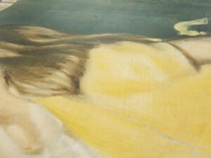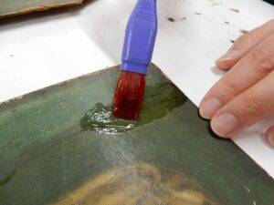 ※1 油彩画において主に仕上げの際に画面に塗布する樹脂の層。作品を空気の汚染から保護したり、光沢を調整するなどの役割がある。ワニスは油絵具とは違う性質の樹脂で作るため後に溶剤などで除去することができる。