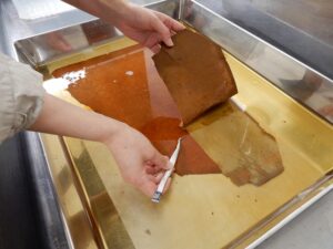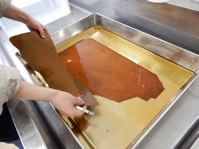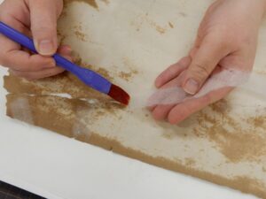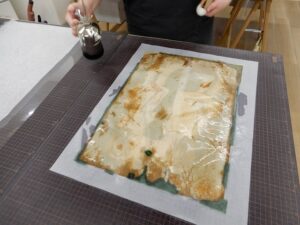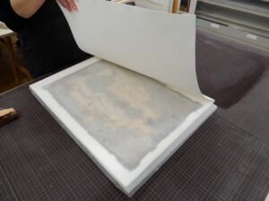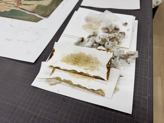水性処置の工程については、脆弱な本紙を保護するため、全体浸漬ではなく吸い取り法を併用した。