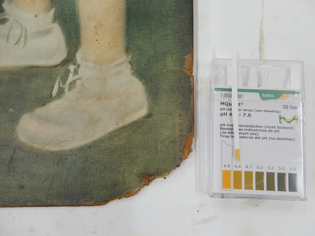 その後、洗浄と同様の方法で水性脱酸性化処置を行い、紙中の不溶性の酸を中和、さらに処置後の大気中の酸性物質からの予防とした。溶液は、紙中に十分なアルカリバッファー(アルカリ緩衝剤)を残すため、水酸化カルシウム水溶液を希釈したものを使用した。処置後はpH6.1への上昇を確認した。