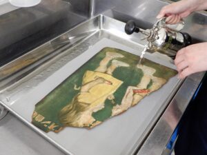 小片を使用したテストにより、台紙に貼られた本紙は、加湿することで安全に剥がれることを確認した。イソプロパノール水溶液で全体を加湿した後、ぬるま湯に浸漬して、接着を緩ませながら裏面の台紙を剥がした。