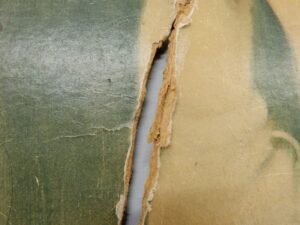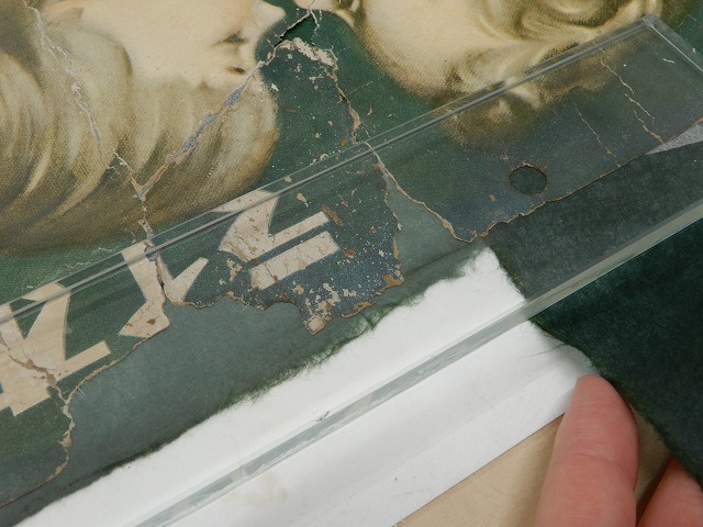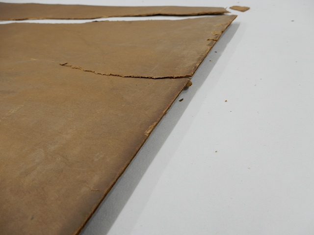 - 本紙自体が酸化・酸性化により変色し、紙力の低下により脆く裂けやすい。これらは台紙側からの酸の移行も影響していると考えられる。