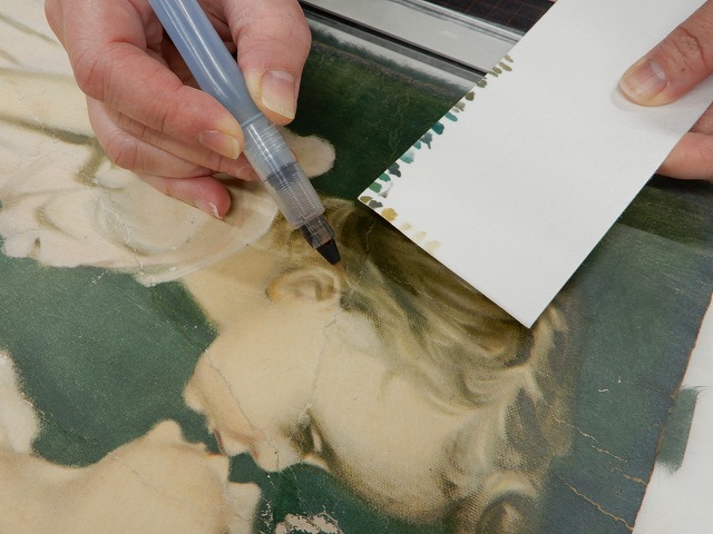 視認性の回復と、基材の劣化進行を抑えるため、黄変したワニス層を除去した。調査の結果、エタノールを溶媒としたヒドロキシプロピルセルロース(HPC)溶液が、下層インクへの影響を最小限に抑えながら、ワニスを軟化させることを確認した。筆で溶液を馴染ませ、溶解したワニスを脱脂綿で吸着除去した。