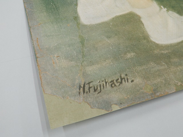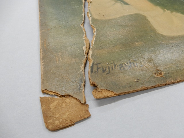 - 台紙の酸性ボードごと本紙が破断しており、中央縦方向の亀裂により完全に二分されている。分離した破片が残っているものの、本紙自体が欠失している箇所も多い。