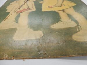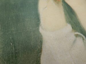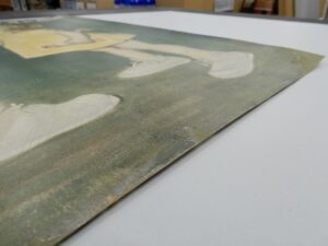 - 黄変したワニスは印刷面を覆い、画像の判読性を著しく損なっているため、安全に除去する。