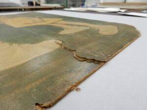本資料は制作年が不詳であり、今後の研究・展示活用の可能性を考慮した保存修復を目的とする。主眼は、構造の安定化、および、視認性の回復とした。