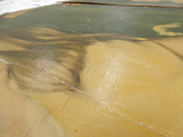 - 表面のワニス層※1は経年により黄変し、全体の色調を暗くしていたほか、ひび割れが生じている。